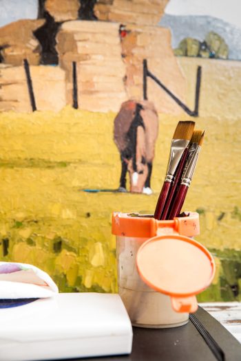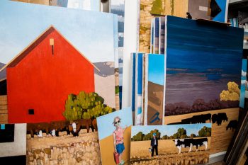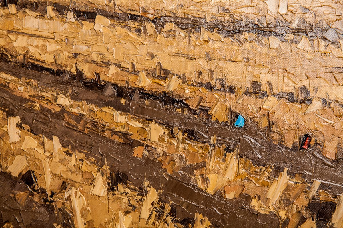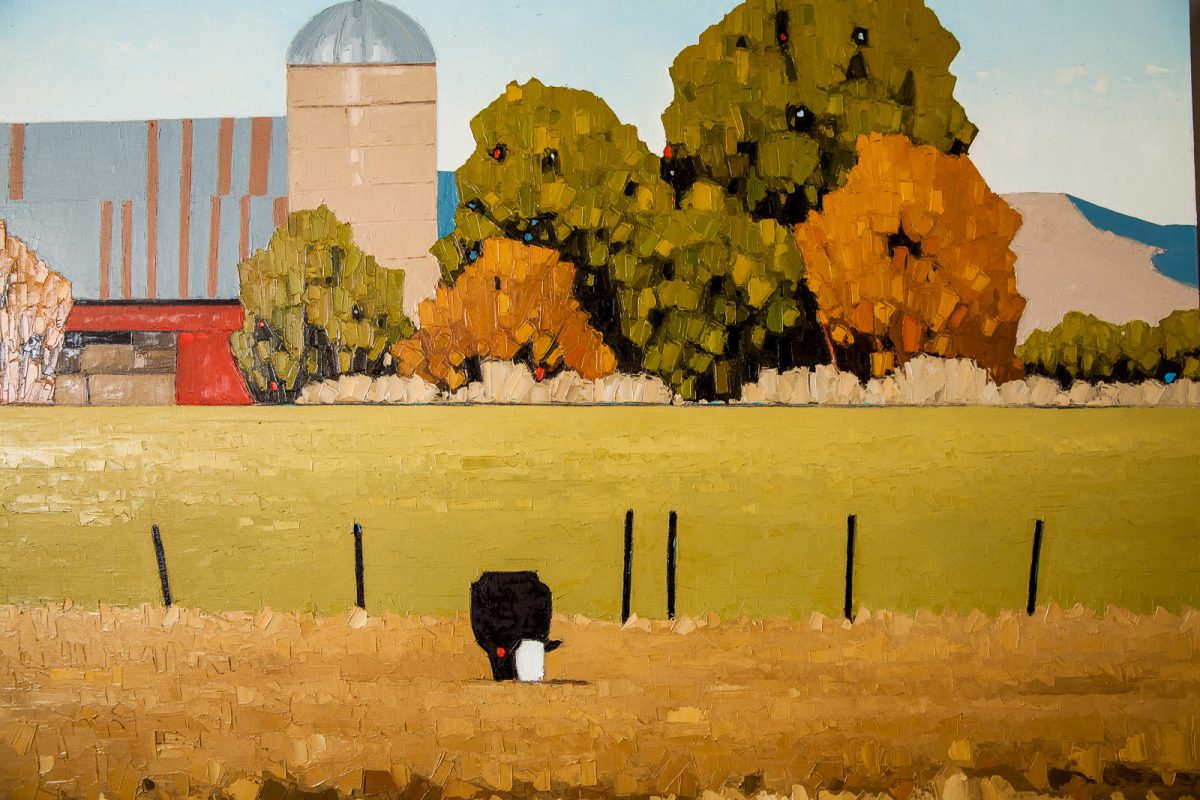 Consider “Fine Dining,” a formally tight painting that is activated by meaning personal to the artist. At the flat horizon line one third down, is the base of a barn, again a flat plane, a brick red. Around the barn are full trees, though sparse in number. These are painted with bold vertical smears of the knife lending a jarring linearity to the crispness of the composition. The main feature of the painting and truest to the heart of Pugh are the centrifugal presence of five cows. Cows? Yes, cows. Pugh, the ever-expressive symbolist, would not typically use his family as a subject in one of his now famously iconic abstracted scenes, so instead, he paints a cluster of five cows, two larger and three (the number of Pugh’s children) smaller. But there is nothing derisive about this symbol. The cow ubiquitously is a beloved animal, a provider of many things, a nurturer to its young, and a deeply spiritual creature in some Hindu cultures.