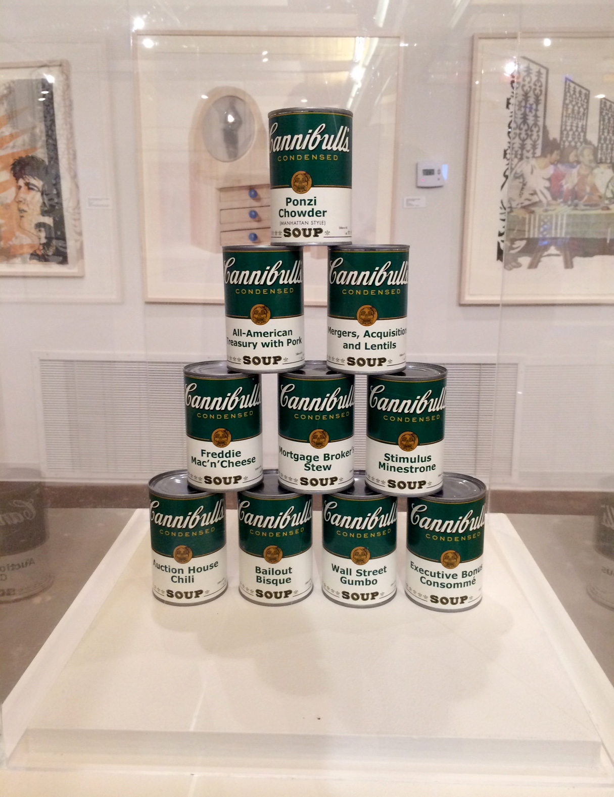 Andy Warhol was the most successful of these artists, able in his early works—before he began worrying about turning himself into an icon—to elevate the mundane consumer products that surrounded him, like soup cans and boxes of Brillo pads, into icons for an age of mass reproduction and mass consumption. His prints of Campbell’s soup cans from 1968 will be one of the first works visitors recognize in the exhibit, because it is an image (or series of images) that has become one of the most iconic artworks of the last half century. We know this because, like any good icon, Warhol’s soup can has become fodder for imitation and mutation by subsequent generations of artists. Utah’s own Ed Bateman, for instance, took Warhol’s conceit and added a touch of local flavor when he created a Campbell’s soup can print with the label spelled out in the Deseret Alphabet. At the Kimball, Enrique Chagoya’s “Pyramid Scheme” riffs on Warhol’s legacy in its own way, inverting the Campbell’s red to green, and changing the brand to “Cannibulls.” Stacked in a four-tier pyramid are flavors like “Ponzi Chowder,” “Stimulus Minestrone” and “Bailout Bisque.” This derivative work will never attain the power of the original, but it does confirm its iconic status.