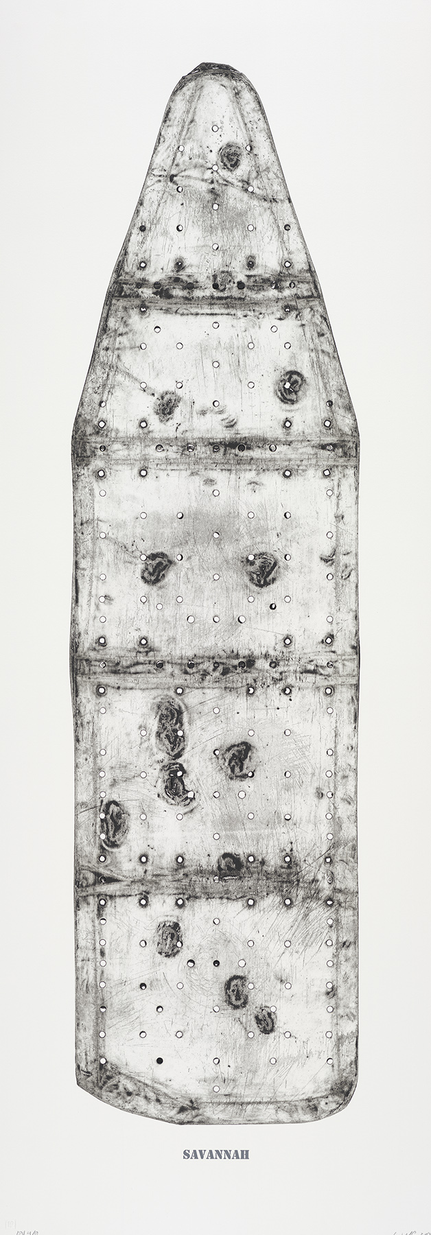 Willie Cole’s pictorial strategy is related, though much more oblique. Local observers may recognize Cole as the creator of “How Do You Spell America,” a piece purchased by the Utah Museum of Fine Arts in 2007, featuring socially charged wordplay using the word “America” on a traditional blackboard. Cole uses readymade objects both as artistic ends and artistic means. His “Steam’n Hot,” one of the few sculptural pieces in the exhibit, combines an upright iron with feathers to create a dynamic juxtaposition between the natural and the humanmade, the hard and the soft, the dangerous and the reassuring. In his “Five Beauties Rising” series, two of which are on display here, he uses old ironing boards (run over by cars and trucks to ensure a flat surface) as a printmaking matrix, to create evocative images that call to mind the domestic — they are named for individuals in Cole’s family who worked as domestic servants — as well as the political — the prints create ghostly images that call to mind slaving ships. The nostalgic aura of these simple domestic devices is turned into powerfully layered images that are not soon forgotten.