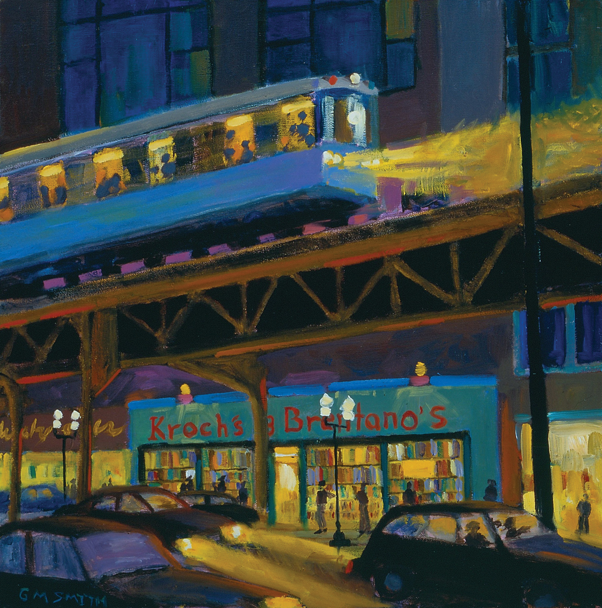 Publishing and painting are intimately connected in Smith’s world. It seems as though the two can’t be separated in terms of his life outlook and values and aesthetics. He likes the combination and has no wish to retire from publishing or from painting; nor does he particularly wish to sell or part with his paintings. He sees them as old friends. “Why I do bookstores is obvious – I’m a publisher, and I want to celebrate book-selling. Bookstore owners are really interesting, always, and their creation, physically, of their little drama with their store is something I try to appreciate through the paintings. And they like it.”