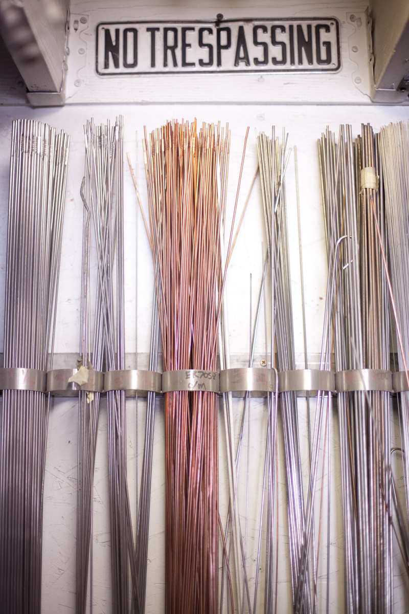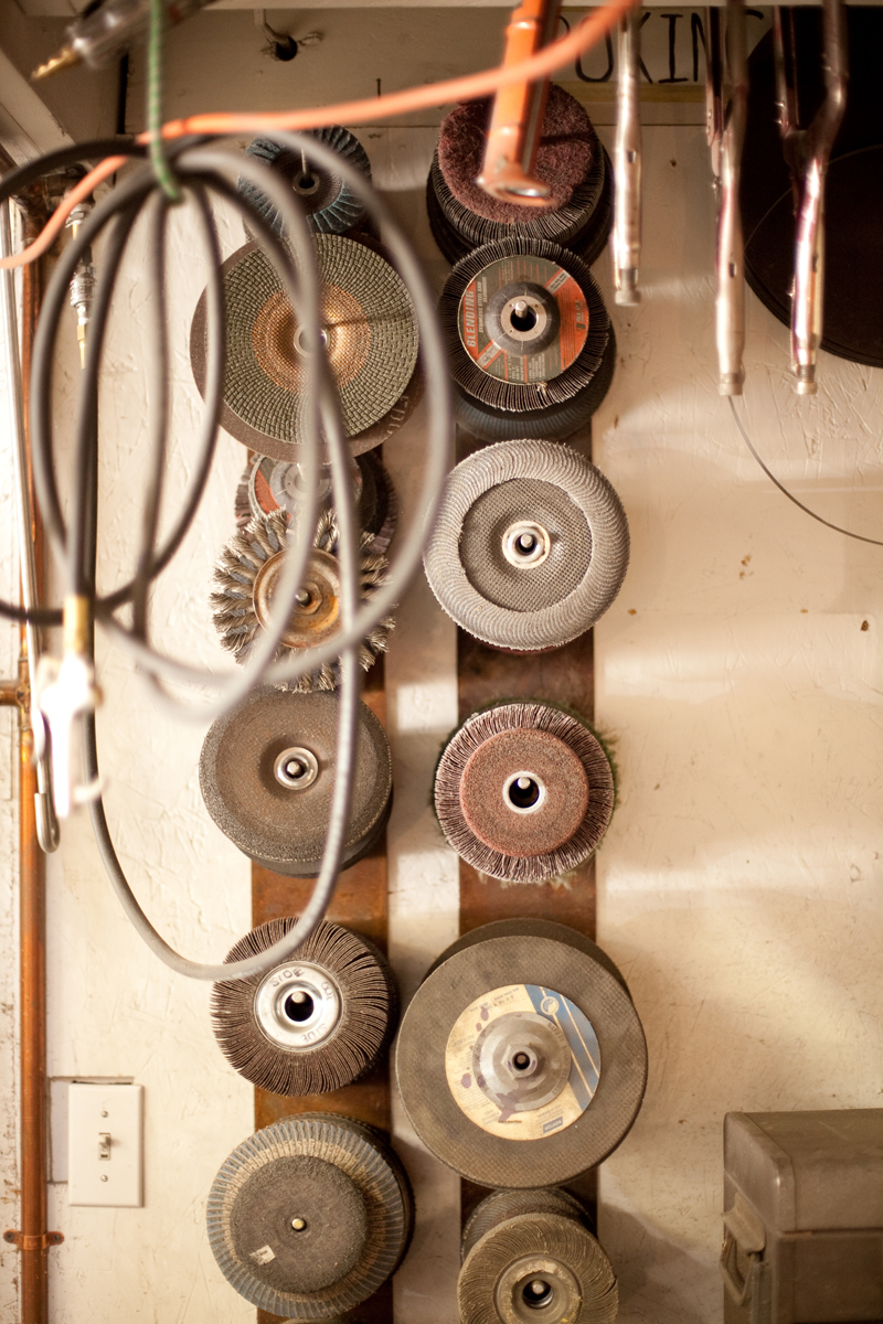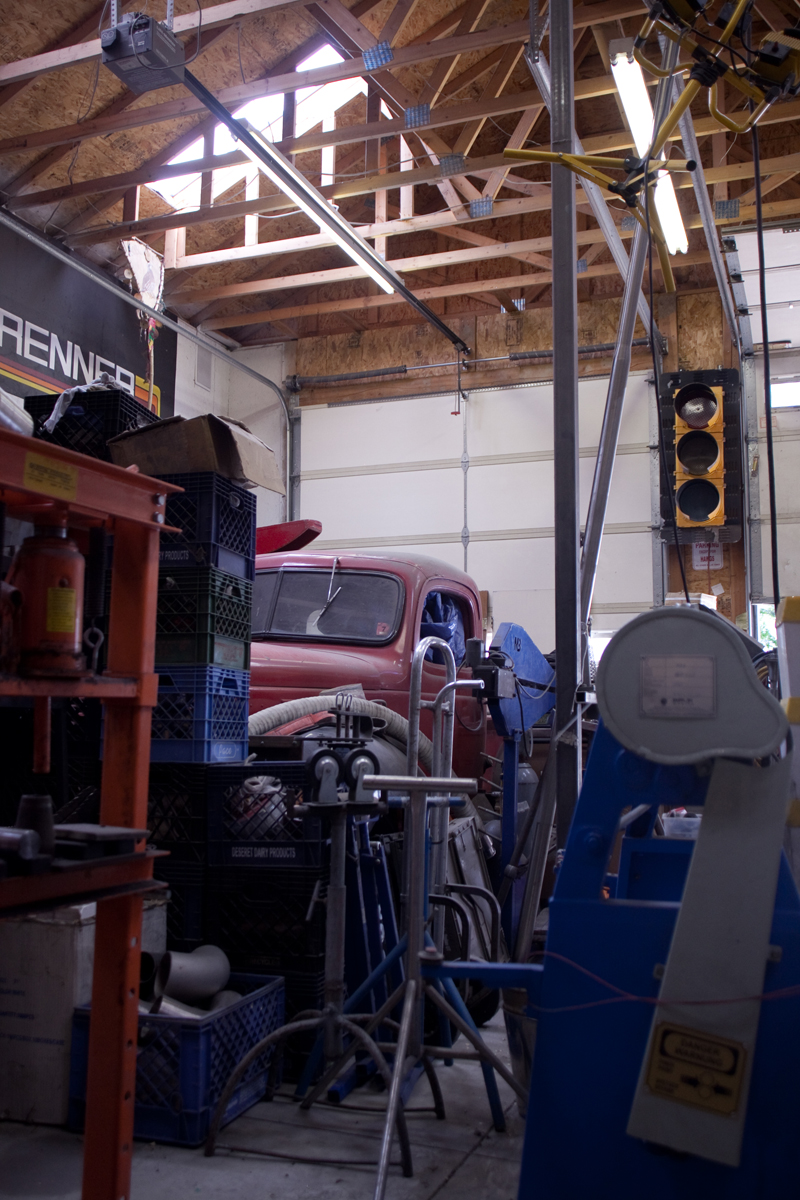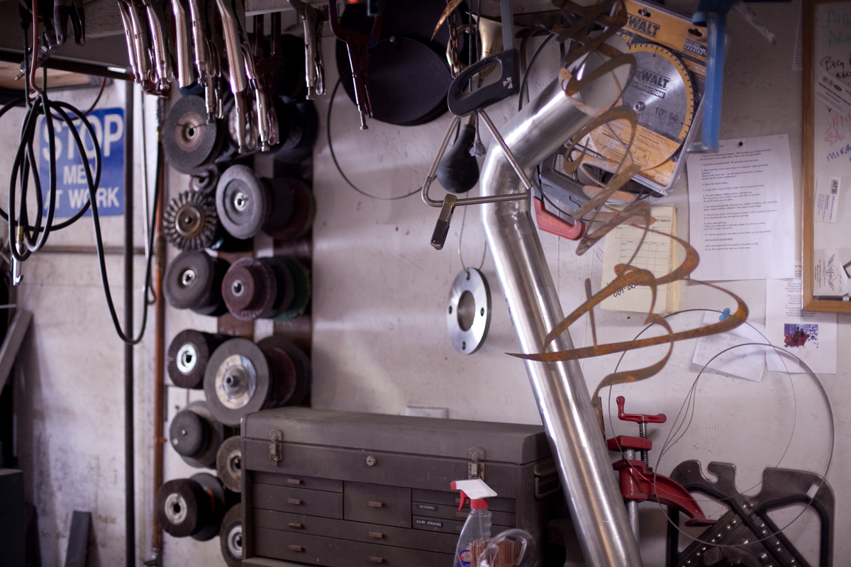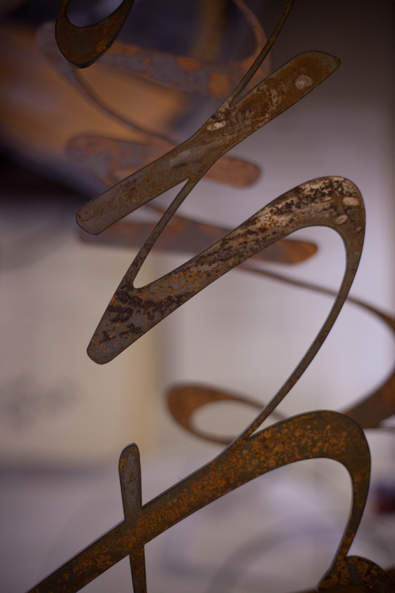 Dan Toone has spent most of his days doing metal work and welding in the food and dairy industry. In his free-time, he welds his own artistic creations, some of them out of scrap materials from his day job, in the studio he and his son built in Taylorsville. The two-story, 1200 square-foot structure features a storage loft, accessible by stairs that can be hoisted up and down. Six skylights flood the space with natural light, a pot-belly stove in the center provides heat, and a collection of signs adorn the walls . Scrap metal may pile up in the driveway, but inside the materials for the sculptures he and his son, Joshua, create are placed in an orderly fashion -- a necessity for working efficiently but also for making room for the studio's other resident, a 1939 red Plymouth truck Toone hopes to someday get in working condition so he can use it to deliver sculptures.