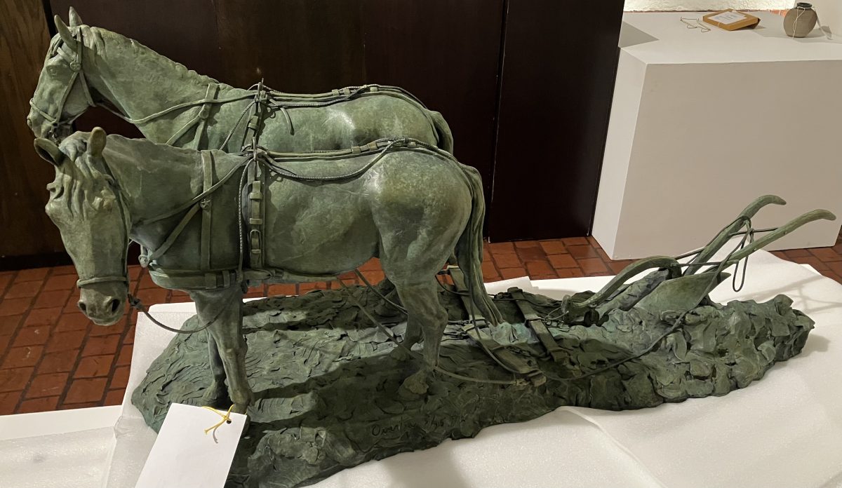 A surprisingly powerful vision of the past, Eric Overton’s “Service and Sacrifice” feels like a love song to a thousand years of technology. As we ponder how much more our darlings, computers, from which we expected so much, can damage our cultural and social networks, Overton recalls in searingly precise detail the climax of adaptation to equine anatomy that was achieved among our ancestors over centuries. The almost instantaneous disappearance of working horses before the curse of the internal combustion engine is routinely commented on today, but their genetically perfected beauty was once fully matched by the instruments of their lifelong forced labor. The turned head of the near animal reveals its unique identity in a way that could break a viewer’s heart. More than a sculpture, Overton has fashioned an inquiry into a gigantic, yet shameful accomplishment of human nature.