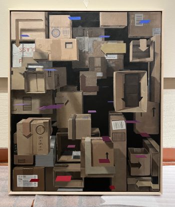 Finally, there is one work that plays on our contemporary symbol of outstanding human cultural and economic achievement—the cardboard shipping box—to let Vincent Cobb, in “Single Point Toured,” make a statement about the brilliance of human achievement and our further potential. The incredible ability of our senses to inform, but also to fool us—trompe l’oeil—is the key to art and so many other things, while the similarity between an assembly of boxes and an aerial view of any of our modern cities speaks to the complexity of our accomplishments: what we actually do with the capacities we possess. There is much here at the Springville Museum of Art to worry the conscientious mind, but a cause for joy at how our many artists, far more deserving than I can gather here, rise to the challenges we together represent.