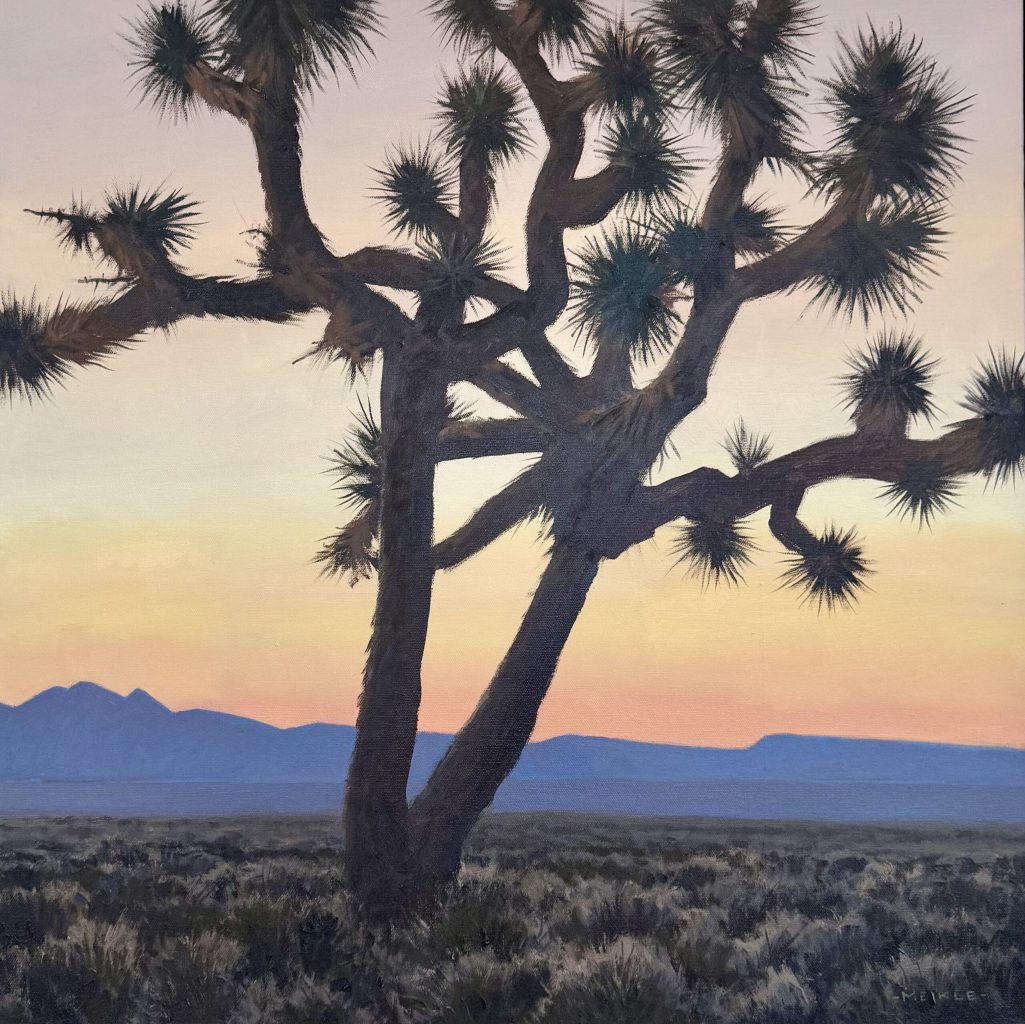 It was Adams, for instance, who chose to shoot through a filter that changed the blank, light-filled, and so white sky to black, bringing out the clouds that gave his mountains and wild places the dramatic feeling they’ve had ever since. Of course Adams was working in black and white, and Meikle can paint his skies blue, but he so often aims his brush well above the land in order to include as much of the sky as possible. In one pair at David Ericson’s, the same Joshua Tree is seen from slightly different angles, but more significantly, the distant hills are seen lit from the front in one and from behind in the other, with two entirely different, but equally compelling effects.