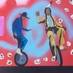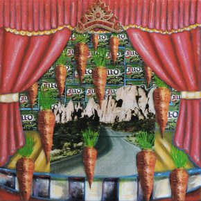 Far from being an all-serious tour of Utah’s problems, Art Behind the Zion Curtainfeatures several artists who use the opportunity to celebrate the beauty of Utah or poke fun at the prevalent problems with which the state struggles. Woody Shepherd’s “Autumn Aspens” is a vibrant explosion of color that could be at home in a variety of exhibitions, though in the context of this one the aspens begin to resemble a fence or wall. Dave Newman’s mixed-media collage celebrates some popular Utah icons: redrocks, Jell-Os and carrots. And “Two Utes on a Unicycle,” by Frank Buffalo Hyde, shows a circus-like scene of two Utes wheeling against a flowered background. The embrace of comedy can be read as an empowering statement against always focusing on the negative or contentious parts of society.