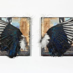 In January 2017, Salt Lake City registered as having the worst quality of air in the country, according to the Environmental Protection Agency’s AirNow.gov, so it seems fitting Nathan Florence and Jody Plant chose to create works that speak to environmental concerns. Plant’s mixed-media piece “Broken Sky,” on two small canvases, features two black-and-white wings facing outward, mounted and separate from their source of flight. Florence’s “The Zion Curtain Inversion” also combines media to portray the soupy inversion that frequently clouds Salt Lake Valley skies in the autumn and winter. His piece features a button-down shirt (a recognizable piece of LDS missionary uniform) pasted to a canvas, with gray, light brown, and white paint partially obscuring a dingy-looking Angel Moroni statue. The usually gleaming symbol of the LDS Church surrounded by haze seems a rebuke to a government that consists largely of members of The Church of Jesus Christ of Latter-day Saints but has yet to propose significant legislative action to combat the deadly air quality problem.