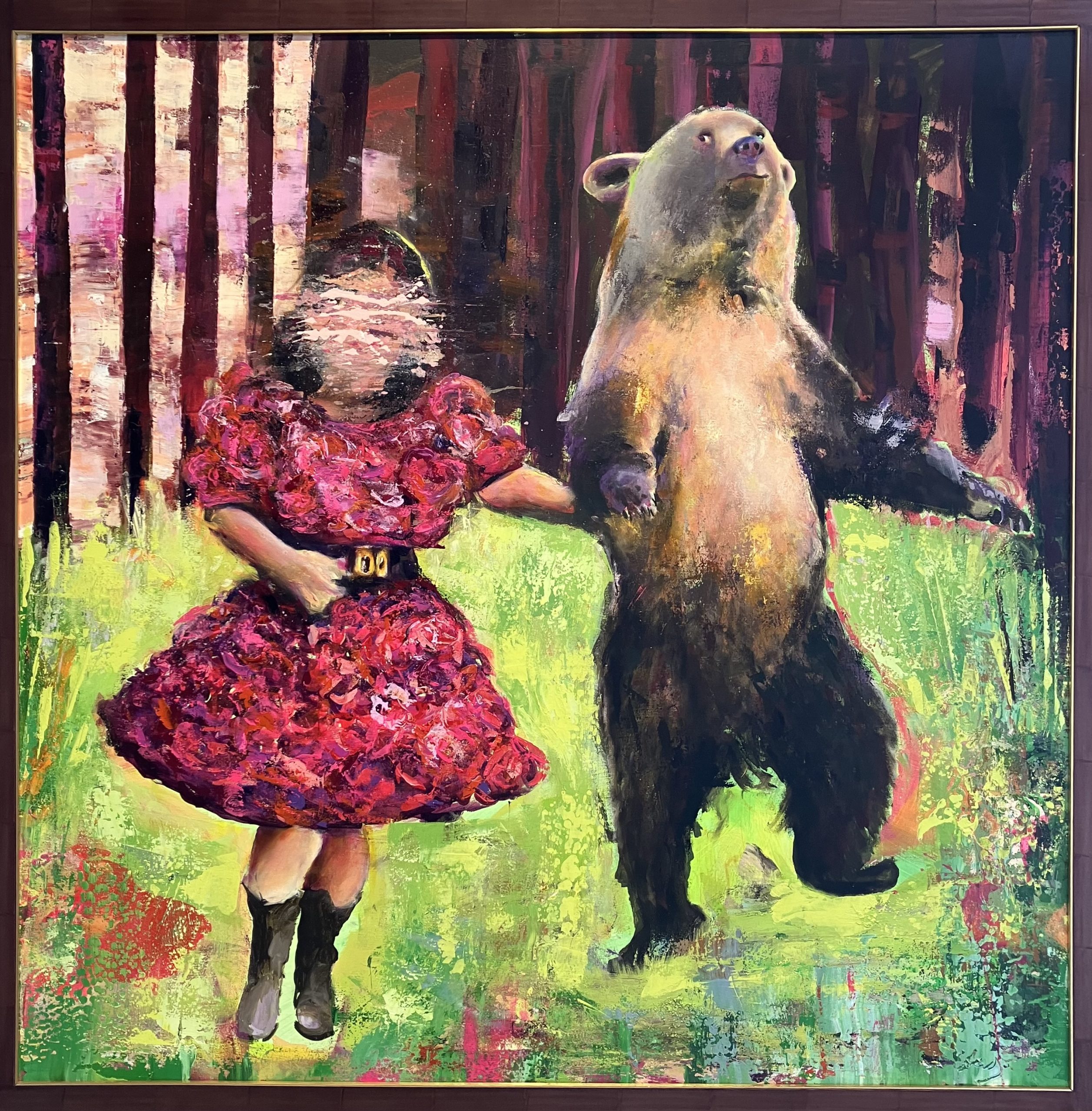 If Godfrey can be hard on his human subjects, he’s a paragon of solicitude with animals. Consider “Secrets Dancing,” in which the fully revealed bear goggles askance as if in this alternate universe it can see what only the painting can reveal: the literal “defacement” of the young lady in the rose print dress and cowboy boots. Although the title refers to the artist’s statement that he’s always “painting intimacy,” this is one of those times when a mystery is several times more rewarding than a simple explanation. In the background of all his works, meanwhile, lurks his insistence that we humans are, after all, animals too, even if we require such periodic reminders. The religious, we might add, are not alone in believing that every living thing possesses a soul.