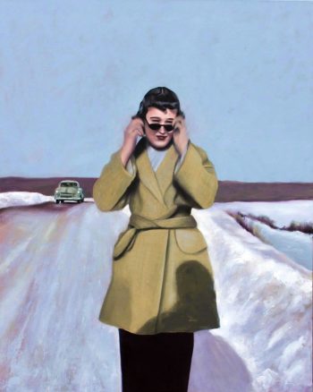 That said, Brent Godfrey is adamant that a painting is never a photograph. For him—and, he would argue, for any real artist—it’s not an instant captured from life and arbitrarily presented exactly as the camera happened to capture it. As evidence, he points to a remarkably compelling painting that only took him a few years—so much for the original plan to shorten the work—titled “Adjustment.” This vintage image shows a woman standing in a parking lot, apparently at the beach, wearing a stylish coat with a tied belt, clearly shot by an amateur whose shadow, falling across her legs, has been meticulously copied by the painter.