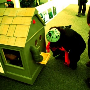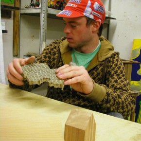 In the Scope Fair at Lincoln Center this year, Metcalf constructed a large-scale home — a house on wheels — an interpretation from his earlier Scope work.|3| As well as processing his thoughts on the home and family, Metcalf was also thinking in terms of commodity and the idea of a fair as a place to invest in cheap art. In this home on wheels, Metcalf again sat inside and staged his taciturn performance. This house was also a factory, fully functional in its process of making small-scale sculptures placed in capsules with seals of authenticity. Metcalf was the sole mechanism of the factory. As each sculpture, made on demand, cost $2, the purchaser passed a dollar bill through a slit while Metcalf would summarily make a buzzing noise, accepting the bill, or often, to great amusement, reject it and accept it on the second try. This performance is purely performatist, an utterance, a provocation eliciting a preponderance of reaction.