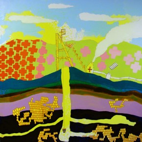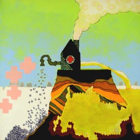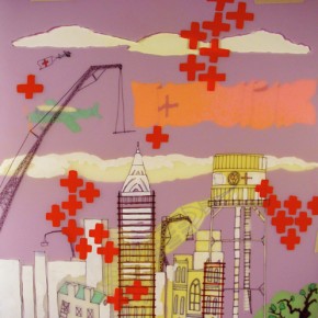 As Metcalf has traveled through his creative journey, he has continued to evolve and try new media. Working on paintings at the moment, something he has not devoted a great deal of time and energy to, he is finding many of his ideas and ideologies coming together. “The work I am doing now is another extension but it is something tangible that conceptually states the substance of what I want. If I can’t I will use another medium.” These canvases are lucid visions, vivid, palpable symbols and suggestions of systems in a metaphorical utopia. It is not correct to say that all of Metcalf’s conceptual body is to be found in these works, but it would be safe to say the work’s ideology is all encompassing. These are not communist hopes but contemporary forging of cities and building new realities. This is not Fritz Lang’s towers of steel but communities whose substance is organic, whose livelihood is built on the present and not an abstracted tomorrow. Metcalf uses motifs repeatedly, all very grounded, such as the honeycomb and the Red Cross symbol. |6-8| His is a viable utopia, but one Metcalf leaves to the viewer to take or leave at will.