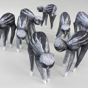 Taylor is a printmaker by trade and training — she went to California to pursue an MFA at California State, Long Beach, and has remained in LA — but her works look more like sculpture. She creates the illusions of form and depth by using fabric-based prints and two-dimensional relief print on figurative forms. The prints are usually figurative in nature so the imposition of figure on figure creates an exciting tension that keeps the piece in a tricky no-man’s land between two and three dimensions.