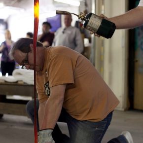 Much of this knowledge-sharing occurs at the guild’s bi-monthly meetings, where demonstrations can range from intense glass techniques to pointers on marketing. This particular weekend Kerry Transtrum has been teaching a class on “cane pulling,” and for the guild’s meeting demonstrates the technique. Using different colored pieces, he prepares his design in a 1 1/2 inch square space. This is attached to a long rod and placed into a small box furnace through a circular opening (the glass art term for this item has now shifted in common parlance to be associated with anonymous encounters in bathroom stalls — hence the embargo on our opening paragraph). Once the square has been heated sufficiently it is dipped in glass, and then suspended from the ceiling. Next Transtrum uses pliers to pull on the glass while another guild member applies heat. They stretch the original design into a cane more than three feet long and place it under towels to cool.