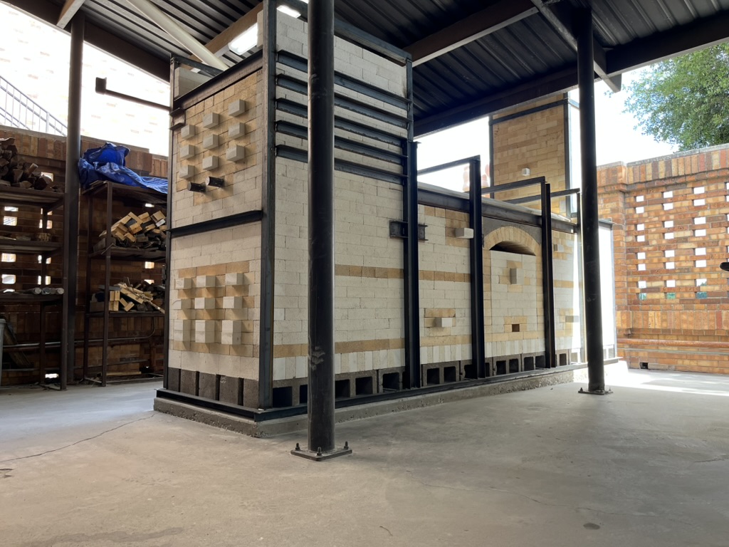 Train kiln built by Neely student Ted Neal at Midwestern State University. The kiln is a variation based on Neely’s original concept and Neal’s extensive, iterative experience. The build took place May 27 – June 3, 2025. Photo by Jaylei Lamb.