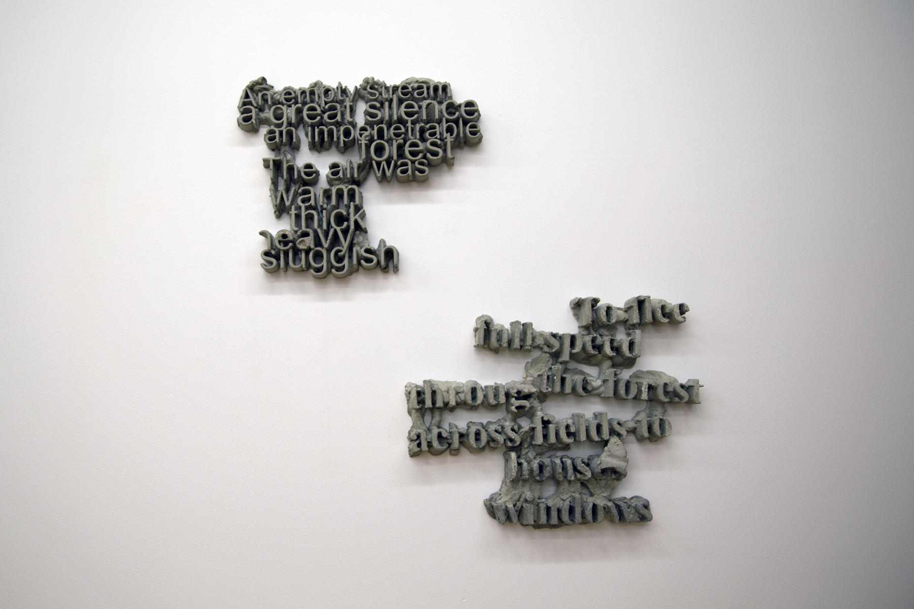 Now in the heart of the forest, the visitor is obscured by an assemblage of word compilations, made out of the same essential stone-concrete. But there seems to be some rhyme or reason here, even if the assemblages are disparate and detached from the other… somehow the visitor feels attached by the reason and logic to be discovered by meaning alone, the very reality of it, even if their stone prison is only an avatar to their display, holding them captive in the heart of this cognitive forest. The first of the “Paved Forest (sculpture series)” reads “The tangle of the forest in his hair. The silence of the woodland.” To the visitor, even on what looks like a crumbling slab of pumice, this evokes poetic thought. The next reads, “To flee full speed through the forest across fields to house windows.” This is very transporting to the visitor, who can feel the reality of the meaning transcending the ugliness of the stone-concrete shell that holds its beauty. The next is astonishing and makes the visitor gasp for air: “An empty stream, a great silence, an impenetrable forest the air was warm thick heavy sluggish.” These words resonate with such a real power within the visitor; here in the density of the forest, that no stone-concrete could compete with… that is only ephemera… this is reality. Further: “lays open before the mind terrified depths trembles before the gaze like a dizzy forest and in which one hears the crackling of dead branches…” Now a terror is beginning to seize the visitor so real has this reality begun to close in on the mind in this cognitive forest. Finally, “that wild heathen Nature of the forest never subjugated by human law nor illuminated by higher truth.” Now the visitor feels the apex of the journey has been reached. That the truth of the language of the reality of the forest has been learned and the visitor is calmed.