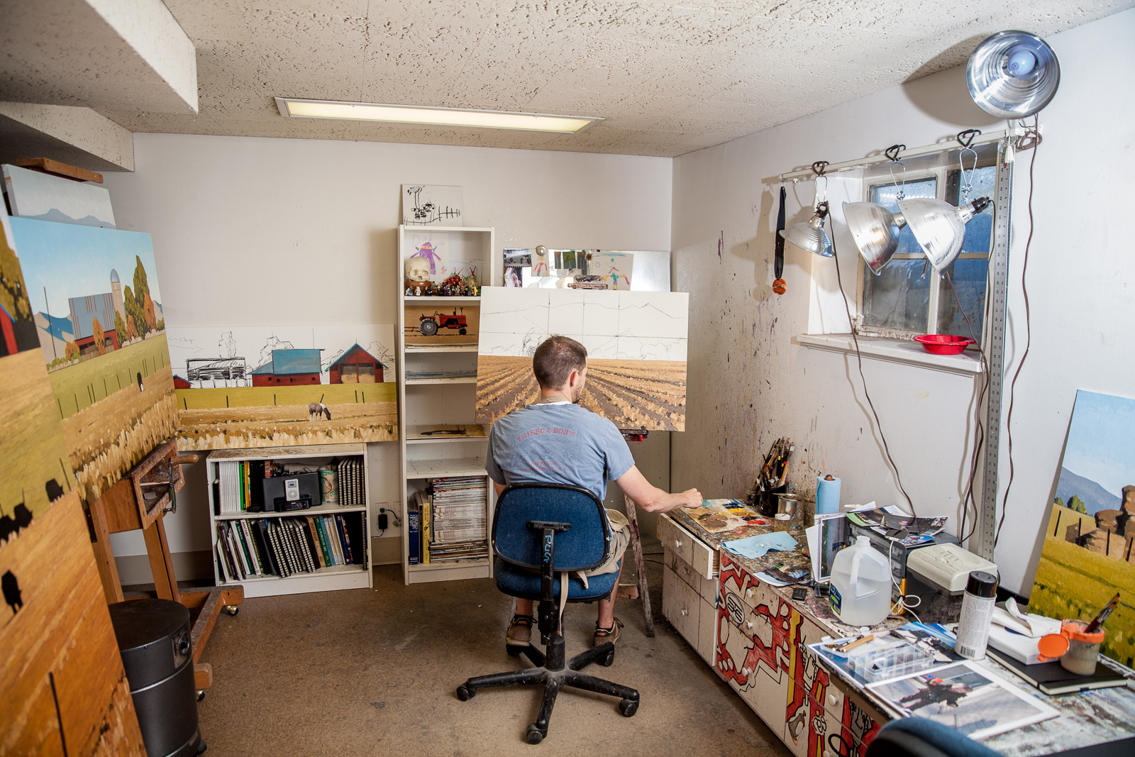 Pugh states unabashedly, “I am a huge proponent that there is God in everything. This includes the division of thirds; the golden mean, in the landscape, in a face, everything about anybody is divided into the golden ratio. Applying that same idea, that principle into my paintings, I think it goes beyond logic into a religious belief, of what I do and what I do with it. There is a reason that I pick the structures that I do.” Further and of even more interest, “If you start looking at these paintings, the root of something like a barn, can be representational of human life, it can be representational of structures of safety, it can be a representation of hard work, or any number of things.”