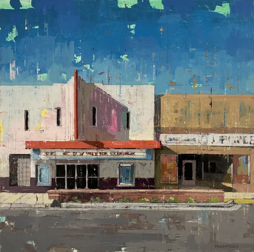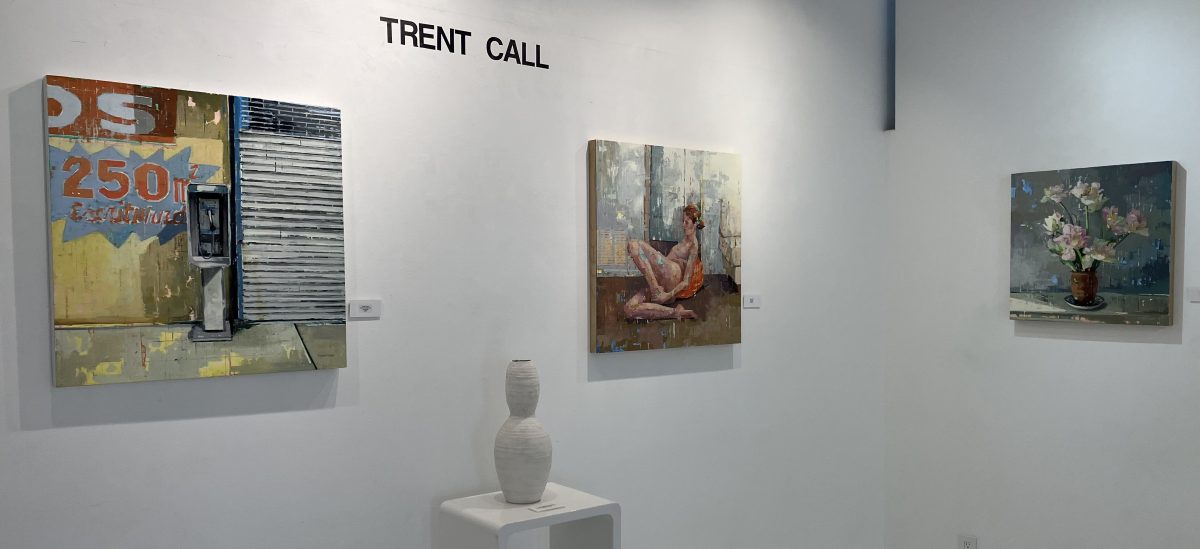 All this said, the most exciting thing about these ten paintings is the cumulative impact of the way they’re painted. Laying down paint layers that show, in barely visible ways, through later ones was an arguably pretentious, 20th-century approach. Capturing peeling paint layers, or even better, peeling layers of posters and advertisements, was a legitimate way to suggest time passing and more subtle facts of life. But Call’s layers are deliberately, identifiably visible through each other, which sometimes suggests tricks of the light, and at other times achieves a Cubist effect, but most effectively, I would argue, brings the painting vividly to life. If the things he paints do not dominate each other, but seem almost to sparkle along with each other, they become more like what they are—mobile, temporary-yet-visible facts. Physical science tells us nothing is really solid; it’s all just patterns of energy that interfere with each other as if they weren’t always in motion, always becoming or decaying. Trent Call reminds us that while nothing is permanent, we are fortunate participants in the dance of reality, in which the object and the observer are partners whose performance is a brief, yet eternal collaboration.