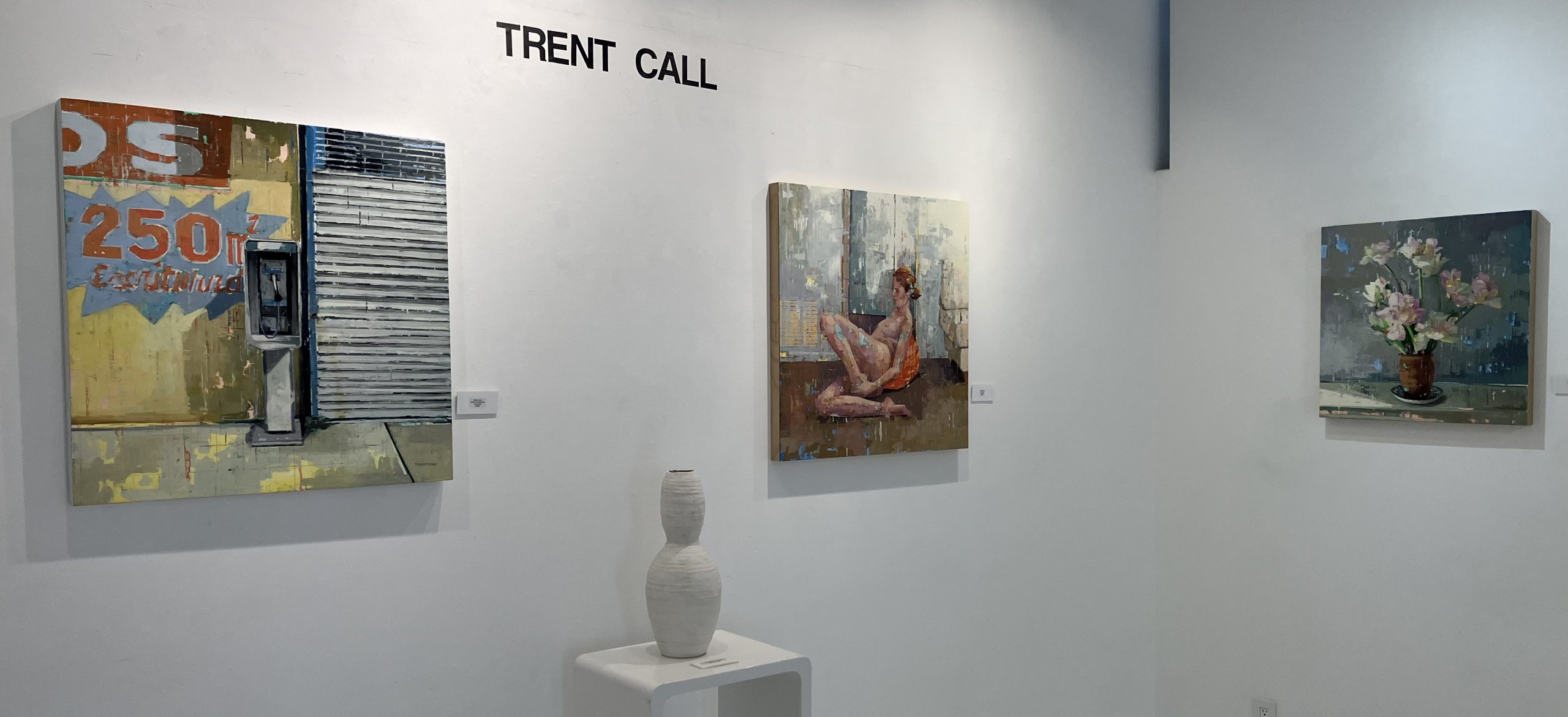 Installation view of Trent Call’s work at 15th Street Gallery with, from left, Call’s “Fuera de Servicio,” sculpture by J. Amber Egbert, “Leg Pull,” and “Parrot Tulips.”