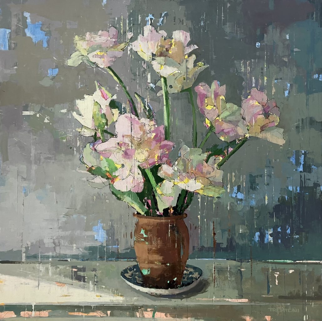 “Parrot Tulips” represents a welcome return on Call’s part to a subject he admits to having neglected—a study of a pot of flowers he brings to life by reversing the entirely proper order of building it. He first splashed his colors in a vivid take on 19th-century Impressionism, and then went back in with Renaissance pen and ink to draw the actual forms of the tulips. Finally, if I’m not mistaken (by no means assured), he returned to the background, which he’d already given a vertical treatment that emphasizes the upright stature of the bouquet, and shaded it to similarly emphasize the light falling on the parrots from the side.