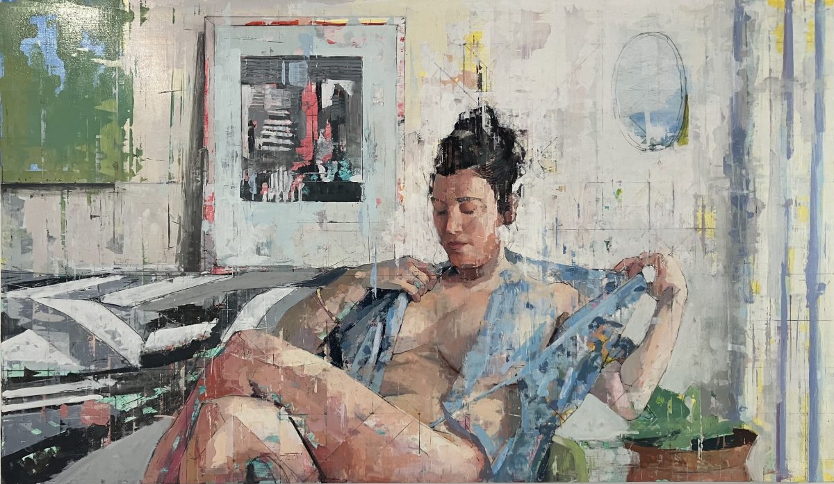 Balanced against “Fuera” is “Leg Pull,” an innovative composition of a subject so well covered it must be hard to find such an original pose. This one may give the viewer’s own body a tug, which gives the body a renewed focus as the major thing subject and audience share in common. Not entirely incidentally, between these two oils the gallery has posed a ceramic vase by J. Amber Egbert that reflects the viewer’s own vertical posture. (Egbert is a personal and gallery favorite who is overdue for consideration.)