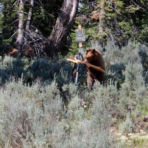 This year was notable due to the abundance of bears in the park. One day after finishing a painting session down at String Lake I noticed an artist friend, Wes Newton off to the side of the road, painting near a thicket of trees. I pulled over and went out to talk to him, when all of a sudden we noticed some people waving to us. Thinking they were just interested in painting, we waved, but didn’t pay much attention until we heard a cracking noise coming from behind the trees where a bear appeared just a few feet away. Of course, we backed off and let Mr. Bear have plenty of room to do what he pleased. His first stop, you guessed it, was Wes’s easel with his field study still attached. By that time I figured that Wes’s painting was toast, especially when the bear got up on his easel. Amazingly though, even after pushing down on the palette and taking a lick of only the blue paints, the whole setup survived along with the painting!