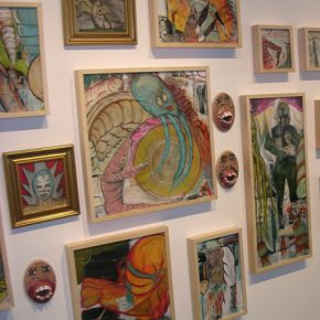 Angelos does know how to use a brush — a couple of his street-art inspired works are on display — but his current interest is in assembling and collaging. His collages, which can include such disparate objects as landscape paintings, leaves, and bingo cards, are slightly obscured by a thick layer of resin applied to the piece, which serves both to unify the colors as well as give the piece the feeling of being a complete object rather than the pasting together of different elements. Angelos’ resin is something you might find in the building materials at Home Depot, which is where he also probably bought the foam material that engulfs some of his other works. One such work, “Jaundice Dog,” was inspired by a recent trip to one of the many new Art Expos popping up around the country. Angelos expected to see a lot of exciting work there, but what he found, instead, were dogs: dogs in acrylic, dogs in oil, dogs in watercolor, dogs in an impressionist style, dogs in an expressionist style. His sardonic salute to the art expo experience features re- and pre- sentations of dogs, from a drawing of man’s best friend to actual canine bones. The combines of Robert Rauschenberg are obviously on the artist’s mind, as is evident in “Tank Rauschenberg,” a black plastic toy tank sprouting raven wings. Joseph Cornell is another strong influence in Angelos’ work, inspiring much of the curiosity box like structure of pieces like “Dream of the Pink Pigeon.” |4|