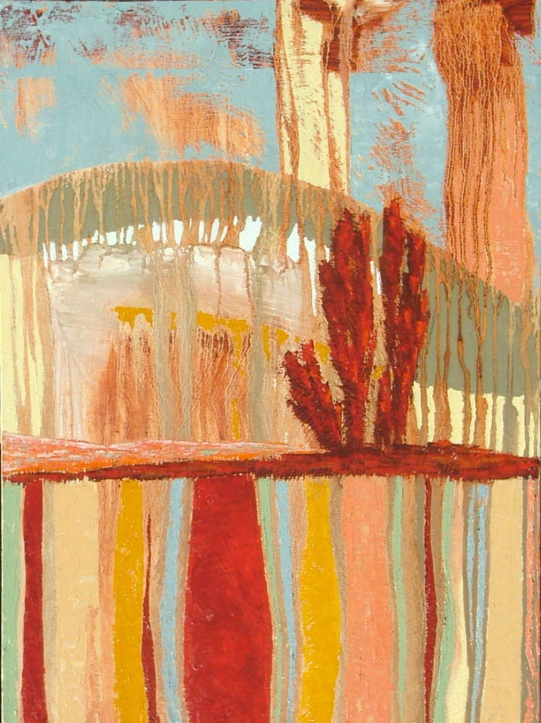 Russon says he likes to work with the number three, a numeral with a longstanding religious connotation. In his landscape “Green Hill” we find in the center three red trees. The implications in this painting are too vast to grapple with, but as Russon describes it, the line falling vertically could represent ancestry; it also represents one’s own past, a personal history, the passage of time; and the central bold line of red in the ground represents the present. There is a certain practicality to this approach; a utility to it, there is substance to this that is the kind that comes from the agrarian, the farmer, but the structures, the abstract compositions, come from the artist.