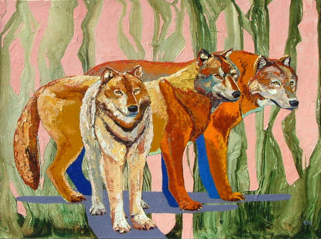 In Russon’s wildlife paintings the animals become strong metaphorical presences while always remaining themselves. The animals become talismans for attributes we might look for in ourselves or others precisely because of what they are. In “Wolf Trio” Russon focuses on the structure of the bodies, and like a cubist, looks for the truth of the form, in and of itself, representational of the animals’ strength, its natural beauty and creation. The wolf is strong and is a pack animal. It will defend the other, it will fight for the pack, hunt and kill. The wolf already IS the metaphor for attributes that Russon’s audience might relate to or aspire to.
