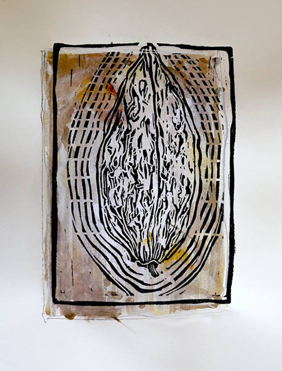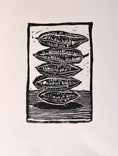 For the art auction, Rees is collaborating with Jesse Peterson to create limited-edition colored relief prints. The theme was easy—chocolate. “I am chocolate obsessed,” says Rees. “For about the last 10 years I have had a cup of hot chocolate every day for breakfast. There is nothing better than really good, high-quality chocolate.” The prints are simple, geometric, with a rough-cut feel. The print of a single cocoa bean especially captures the rough texture and complicated surface, paying homage to the intricately beautiful, natural shape.