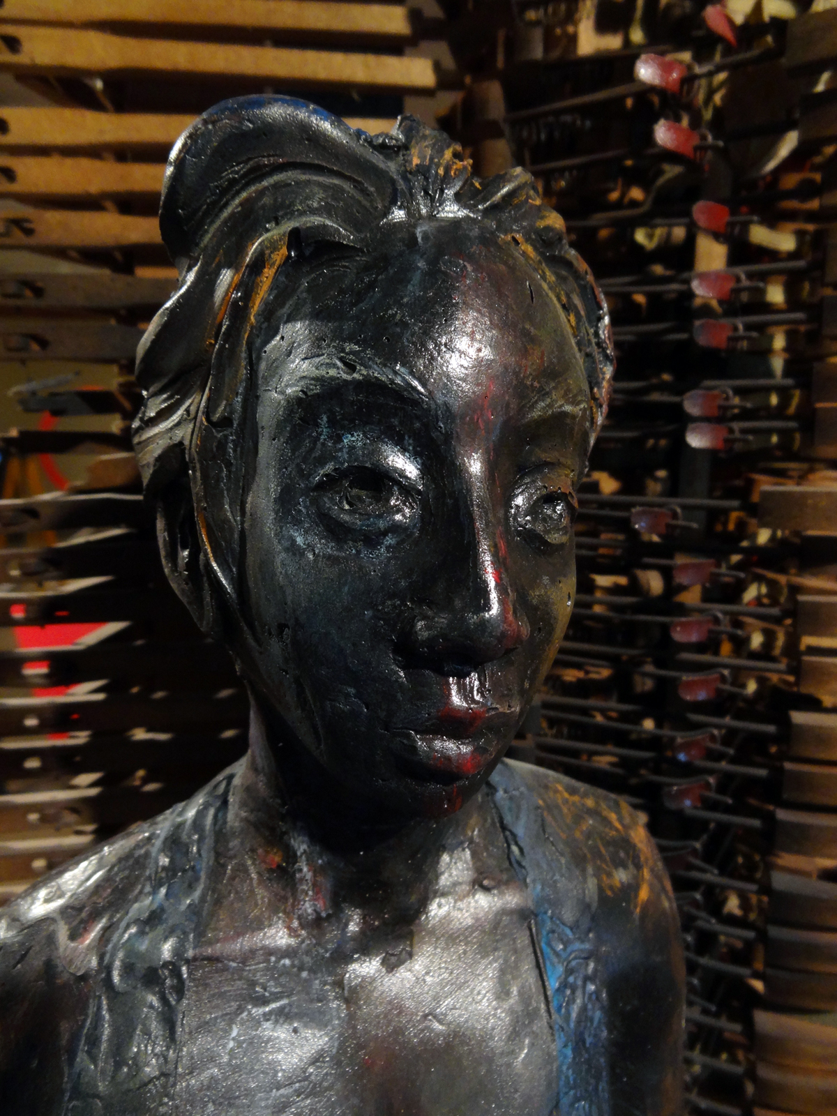 It sometimes seems the three dimensions of sculpture impose more limits on an artist than do the two of painting, but contrasting representations of the human form argue that the range of possibilities in sculpture is as wide as the artist’s vision. Julie Lucus opens up the torso in “Nevermore,” where her signature mosaic tiles suggest the stone walls of a prison or a fortress, a suggestion underscored by the presence of barred windows behind the occupant, who dwells close to the heart. Emily de la Cruz Ellis takes an opposing view in “Don’t Look Back in Anger.” Obdurate and opaque, her sandstone blocks lie silent on the floor, denying entry and suggesting John Donne was wrong: everyone is an island, no one can be known. But Brian Christensen’s “Blue Note” gets it right. Our own knowledge and experience allow us to decipher the features of his standing female figure, who proffers us the crystal she holds in her hand as though it were the key to her sorrow. The ruined piano mechanism that frames her and carves out her space, stopping our eyes from straying, suggests another kind of passageway: the evocative art of music, tinted with aural color the way her skin carries the shifting hints of pigment. Like sounds, appearances can carry something essential between us. There are conduits by which we can know and—sculpture being supremely tactile—touch one another.