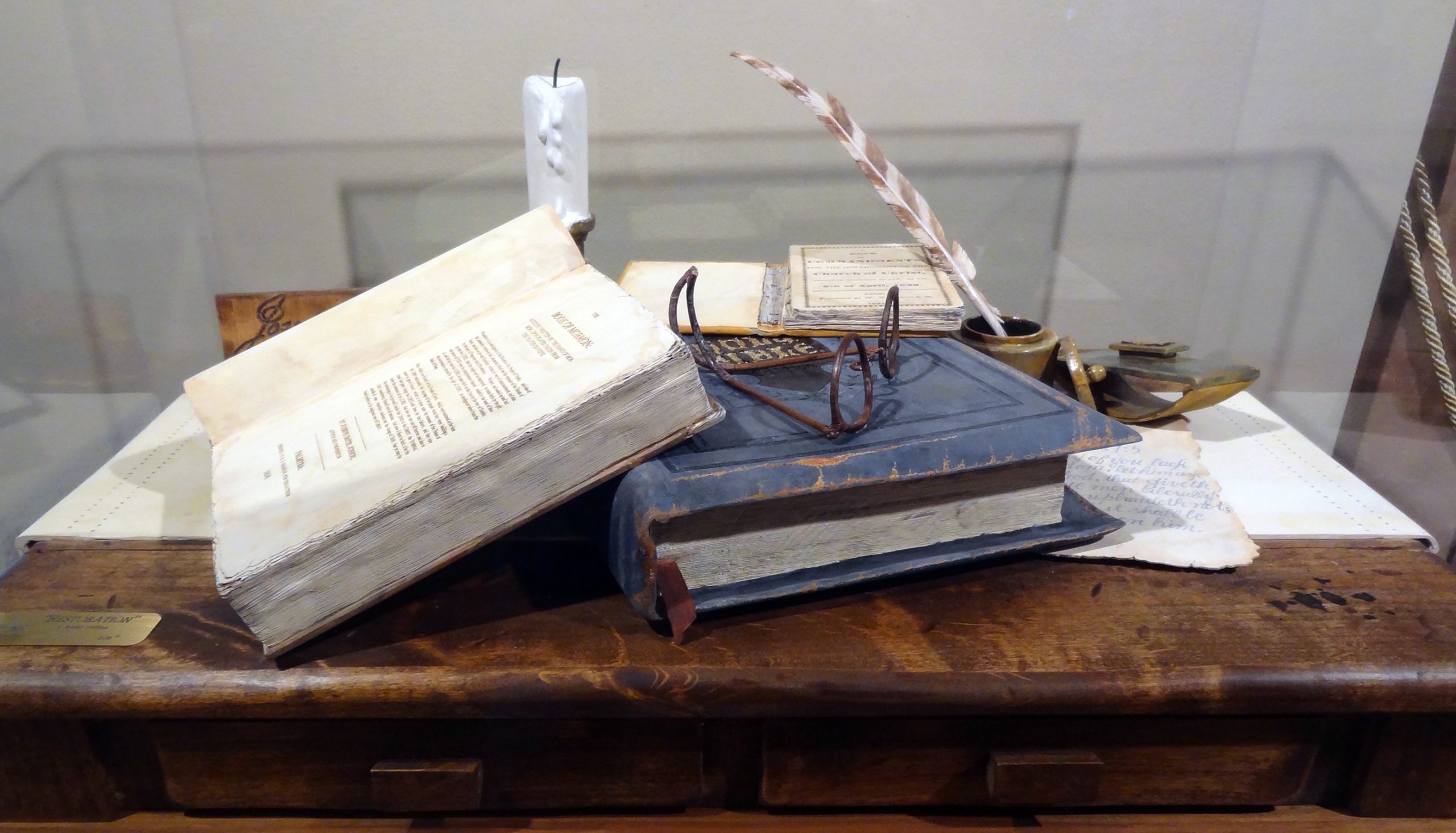 No survey of 3-D art could be complete without a few examples of trompe-l’oeil — in which the sculptor displays his skill by fooling our eyes. In effect, such illusions argue that touch remains more reliable than its more popular, more glamorous, and more successful long-distance version: vision. Relegated long ago to the status of stunt, of trompe-l’oeil, made a comeback when Jasper Johns rendered mundane beer cans in painted bronze, those transformative and supposedly ennobling materials. Perfectly illusionistic tours de force followed, including leather goods made of clay and a motorcycle carved from wood. Darwin Dower has also chosen wood, but a more homely and more challenging array of subjects. “Restoration: A Divine Calling” reveals what a desktop was before the computer undertook to steal its identity and displace so many once-familiar things. Among the objects and materials it ‘restores’ are leather bindings, printed paper pages, spectacles, a candle, and the compound paraphernalia of handwriting: a feather quill, an inkstand with cover, a blotter, and a bit of foolscap displaying a fine hand. There can be a fine line between pleasure and frustration, and as the eye wanders along the ragged edges of well-worn paper pages, the mind crosses back and forth between the imaginary pleasure of turning over those pages and the frustration of knowing it to be impossible.