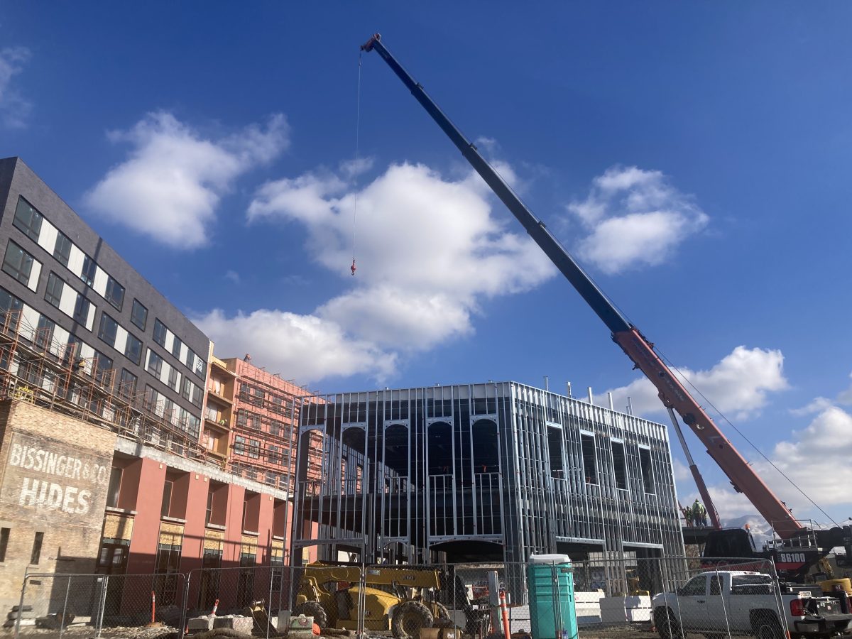 Construction crews work on the new Pickle Building site in Salt Lake City’s Granary District, where a steel frame now rises beside the preserved Bissinger & Co. Hide Building—marking the latest phase in the area’s ongoing transformation. Image by Shawn Rossiter.