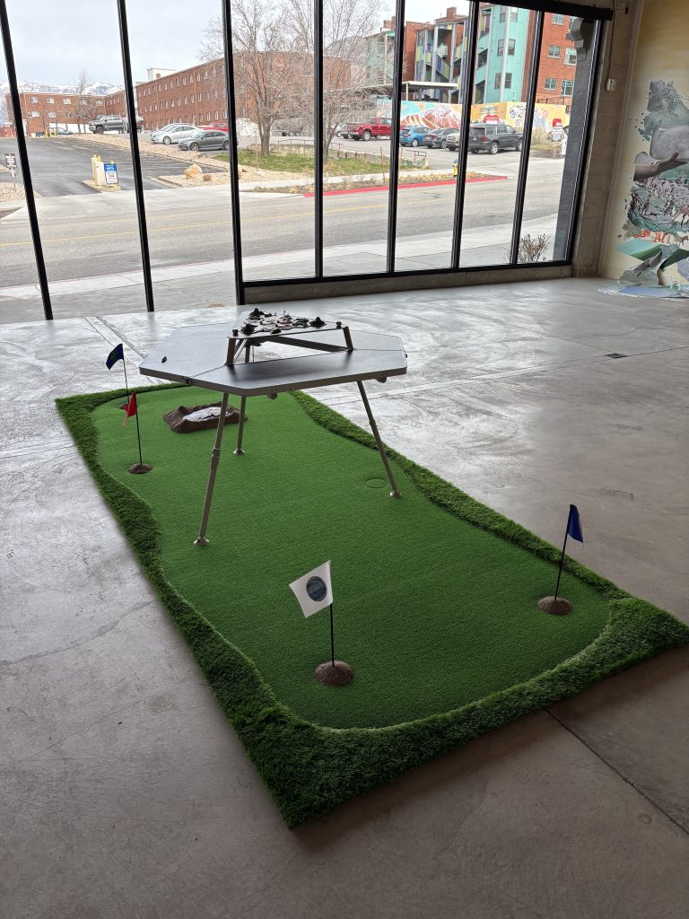 Lani Asunción, Settlers of the Pacific, installation view. A customized game table referencing the board game Catan sits atop a golf-green-like surface, critiquing the commodification of land, tourism, and militarization in Hawaiʻi.