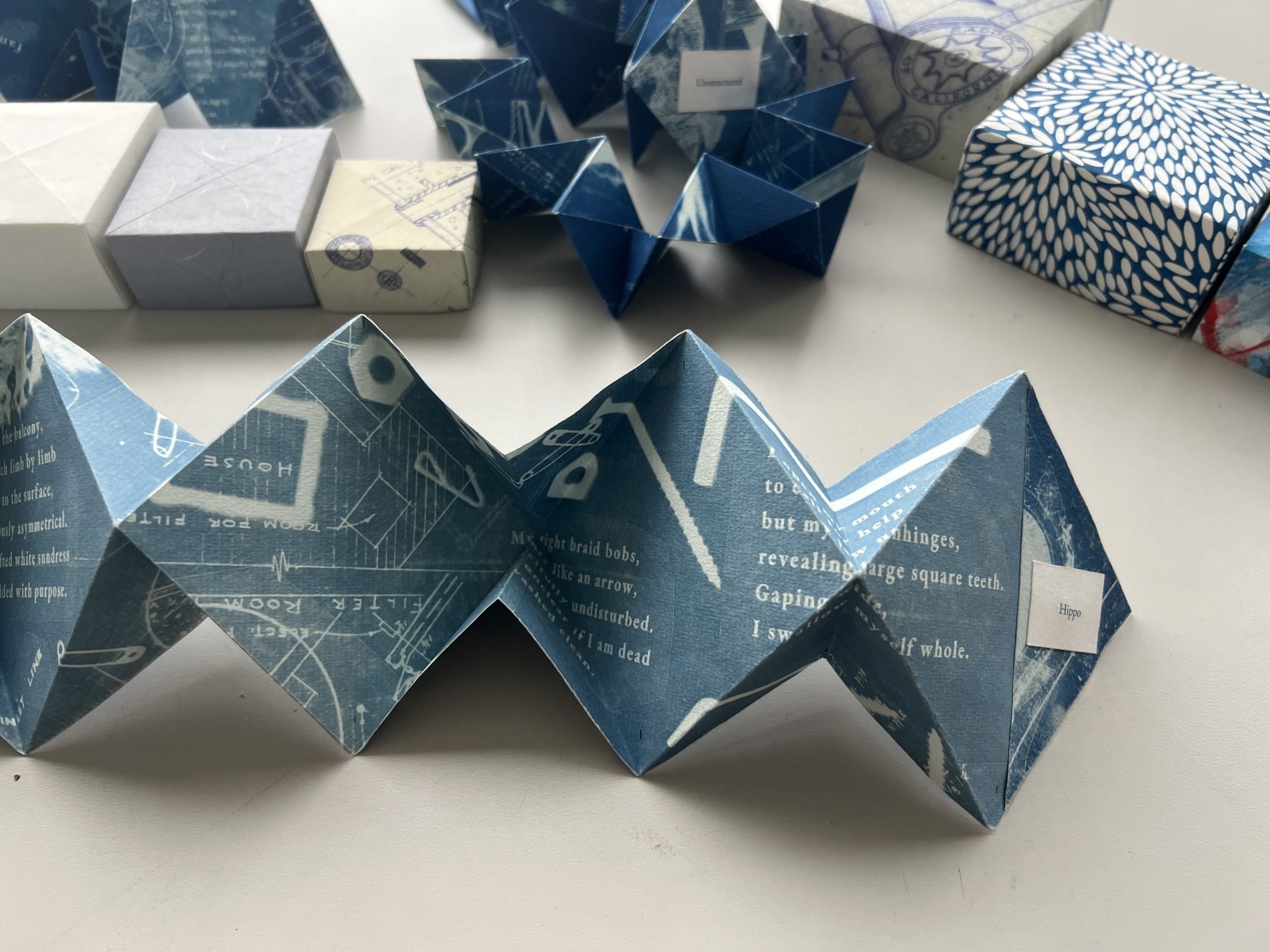 A blue cyanotype artist book arranged in a zigzag fold on a tabletop, its pages printed with layered text and blueprint-like imagery; additional folded book objects and patterned boxes sit blurred in the background.