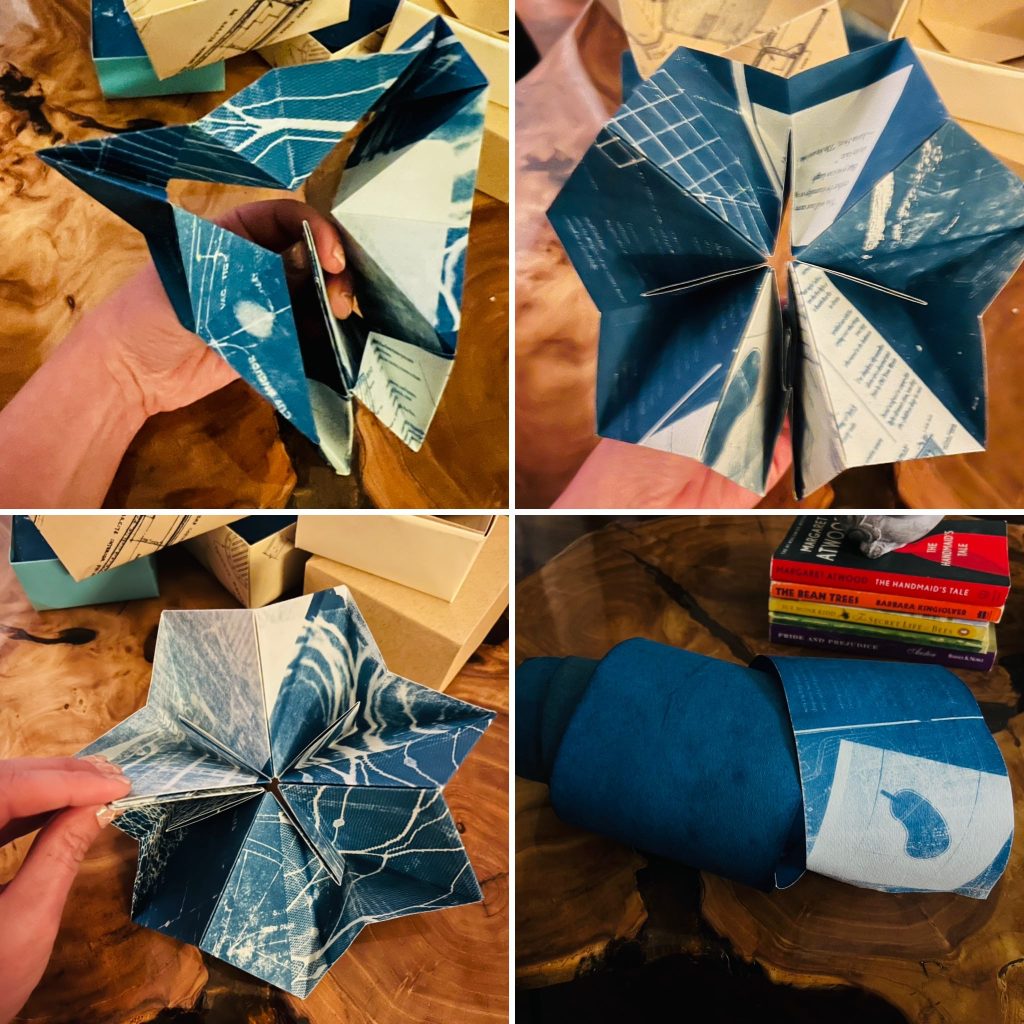 In “Deeper,” a recent work, Challis works with cyanotype on bugra paper, using a modified, custom alternating and continuous “Turkish map fold” to produce a seven-piece limited edition composed of multiple two-sided books. Each piece was hand-coated in chemical solution and exposed individually, layering text with blueprint drawings printed on transparencies alongside lace, thin paper, tools, and other small objects. Structurally, the books contain hidden magnets that allow them to connect “cover to cover in a circle,” creating a form that can be manipulated, rolled, and handled—“like a fidget toy”—as the strong magnetic pull encourages tactile engagement and play as part of the reading experience.
