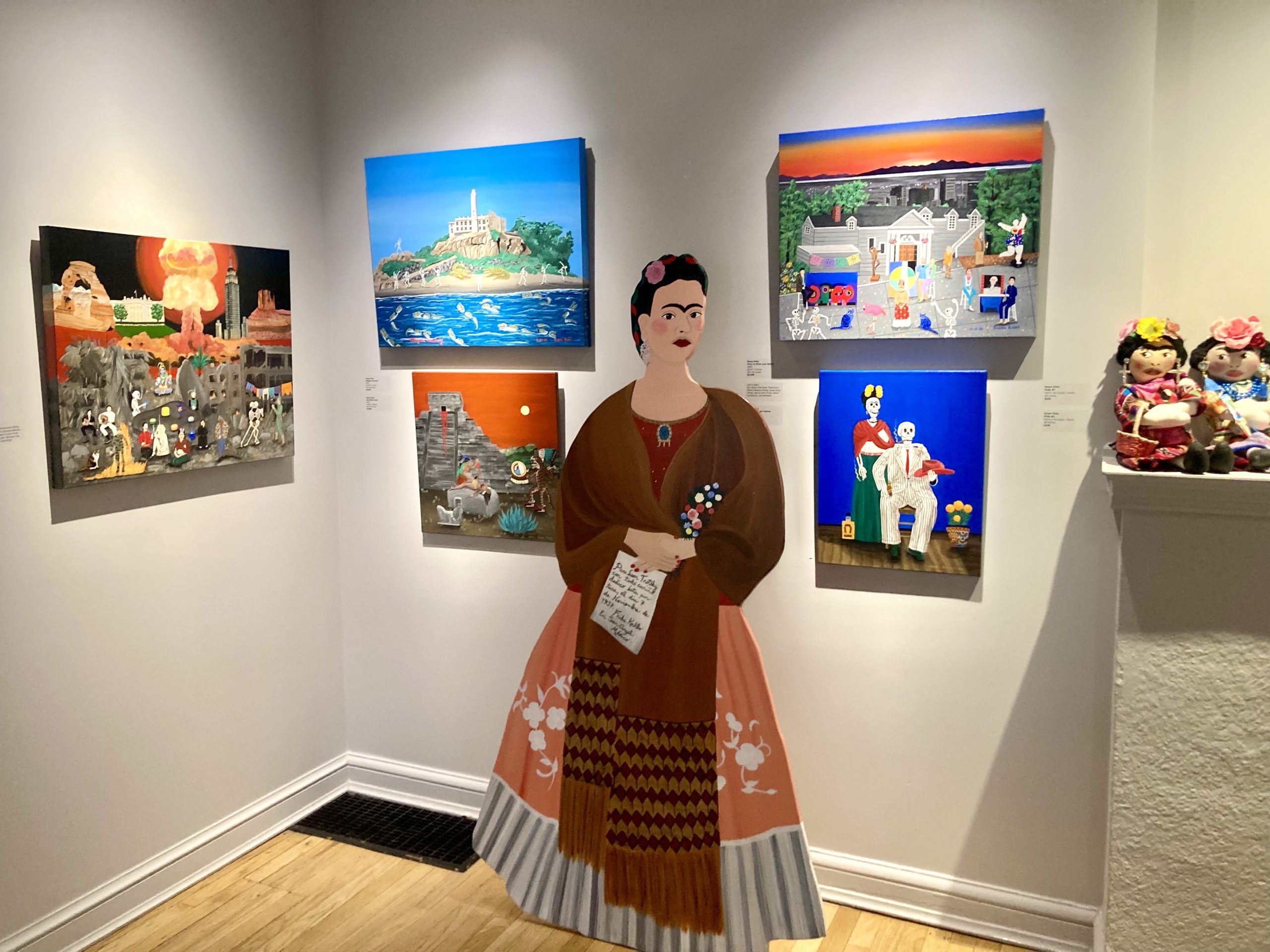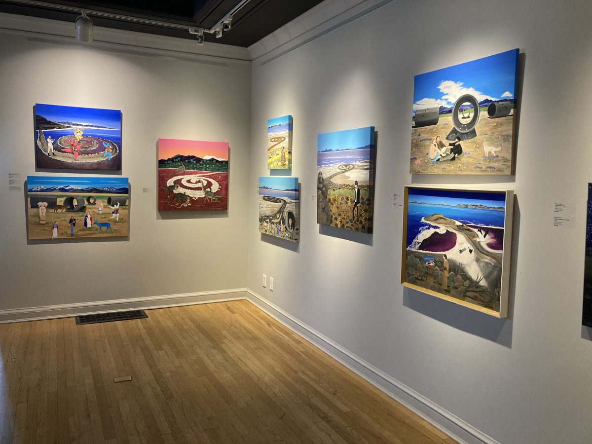 The sun and warmth and beauty of the rich Mexican heritage contrast with her more current works of the Western high desert, where she uses more blues and grays and sages. The dinosaurs of Utah’s Jurassic history create scenes of what this place used to look like before human eyes ever caught a glimpse. Bringing the fossils and ancient artifacts of this place to some form of visual reality, imagining when T.rex tromped along the shores of the lake looking for their next prey, and pterodactyls soared overhead in the wetlands. Like the Natural History Museum’s way of putting visitors in the timeline of Utah’s loaded paleontological past, Kirby gets viewers imagining what if – what if these creatures still roamed, what would our landscapes look like. She also uses iconic images of Utah’s land art, Robert Smithson’s Spiral Jetty and Nancy Holt’s Sun Tunnels as backdrops and playgrounds for figures from pop culture and art history.