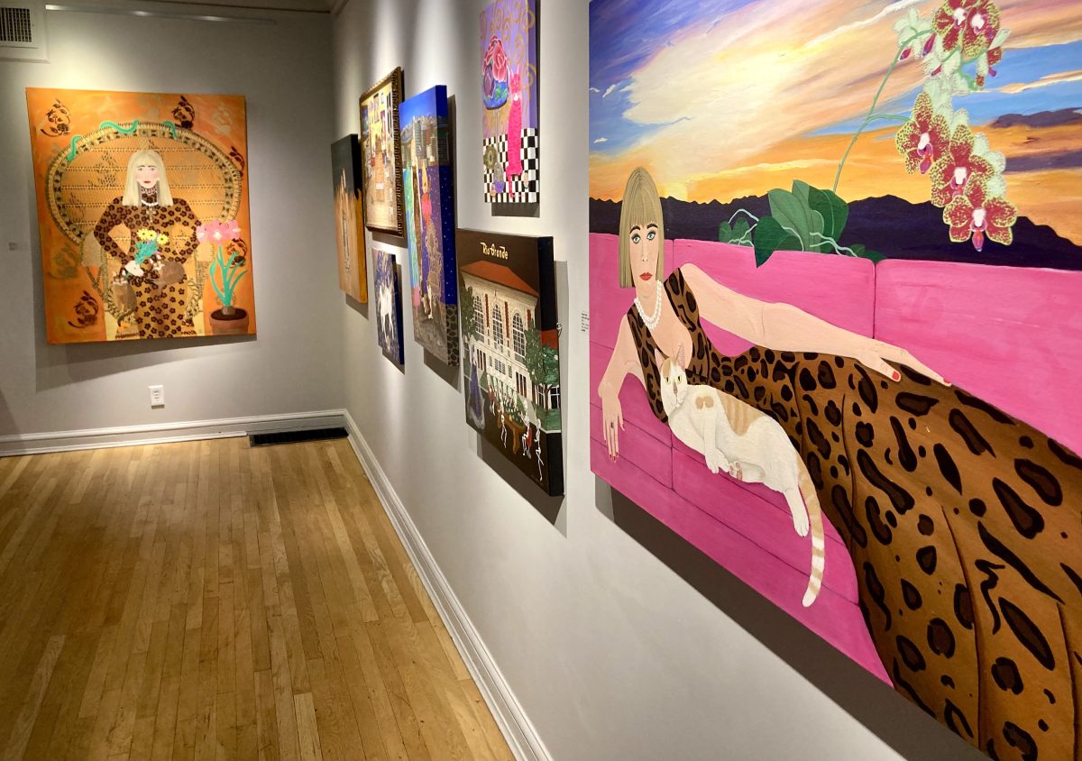 Kirby’s older pieces showcase large, regal self-portraits, the artist sitting with her signature silver blunt-cut bob and bangs in thrones adorned with her feline companions. The portraits are feisty, almost Cruella De Ville-esque—without the animal-killing part, just the girl-boss, intense bad-bitch energy the puppy villain embodied. Gaudy pattern clashing and an intensive use of the cheetah print, in proper early-aughts fashion, stamp these pieces as prime examples of fads of an era. Rhinestones pock her canvases while her cats sit languorously around her like royalty on her throne.